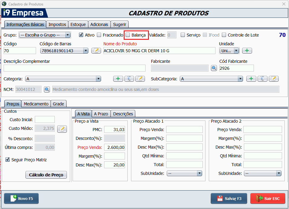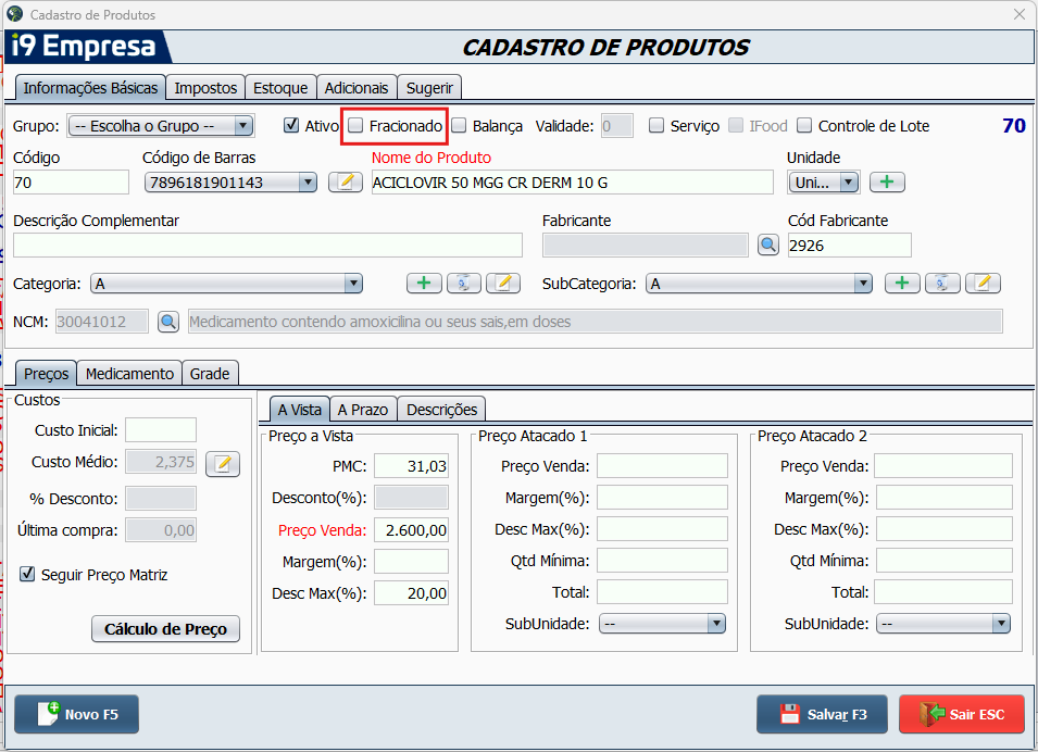 Se sua operação vende unidades menores (ex: 0,3 kg, ml, metros, cápsulas), marque o produto como fracionado. Assim, o ERP permite venda com casas decimais.