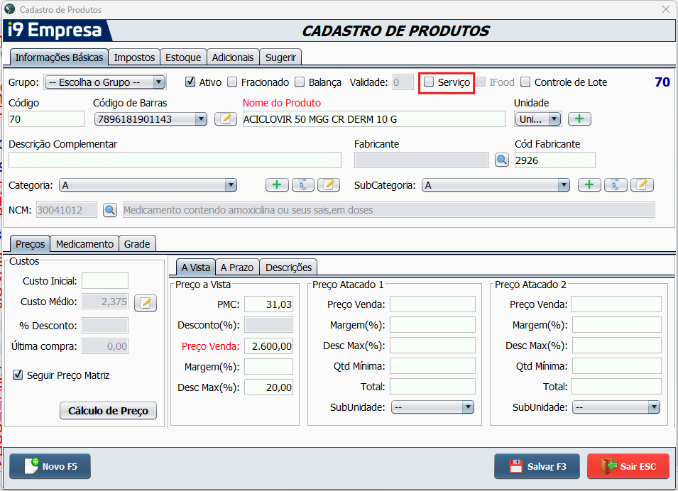 Se o item está marcado como serviço (ex: manutenção, consultoria, instalação), não terá controle de estoque e segue regras fiscais específicas.