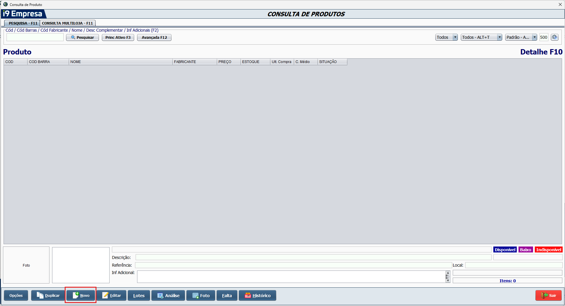 Na tela Consulta de Produtos clique no botão Novo na barra de botões inferior, conforme imagem destacada.